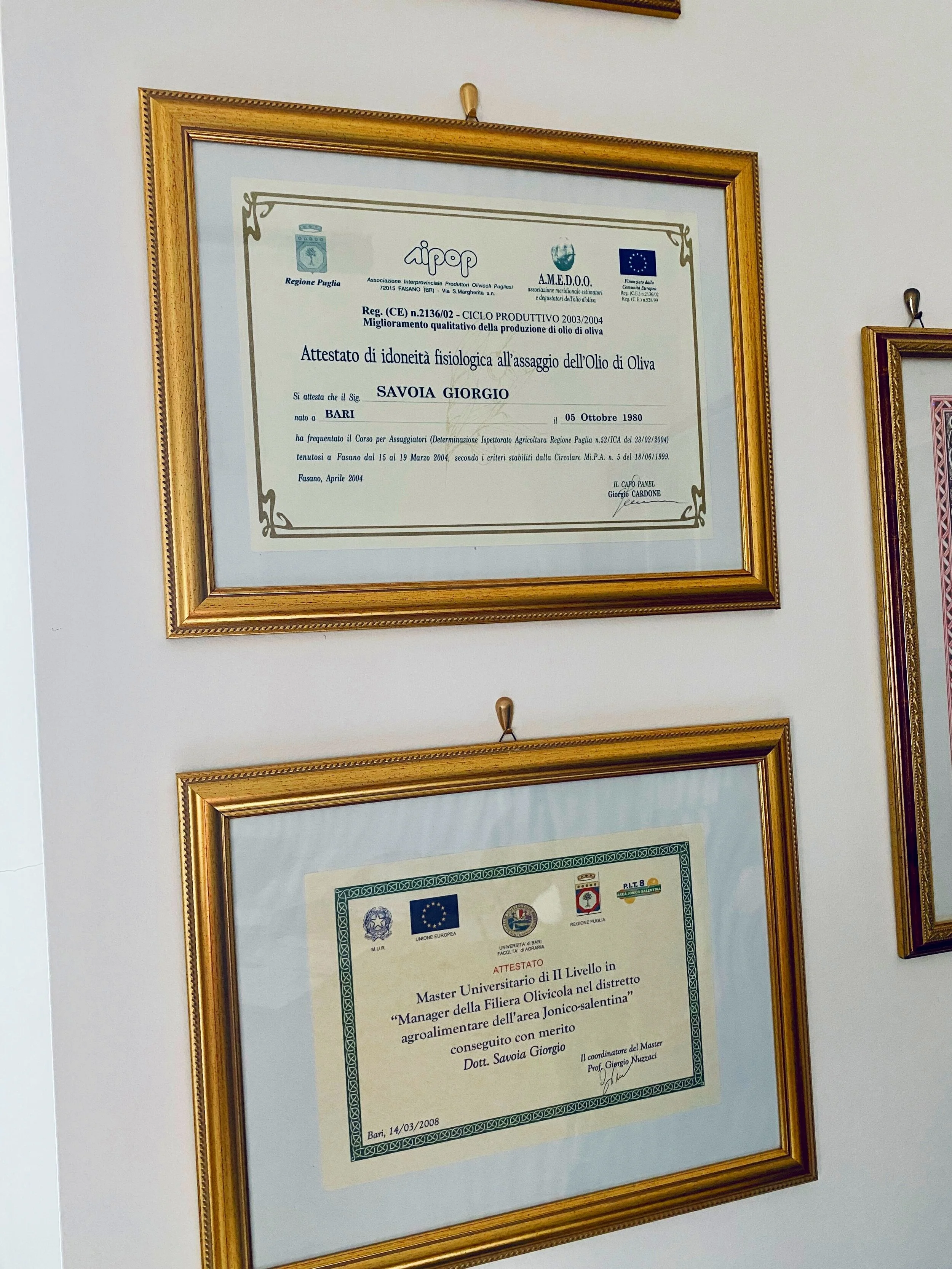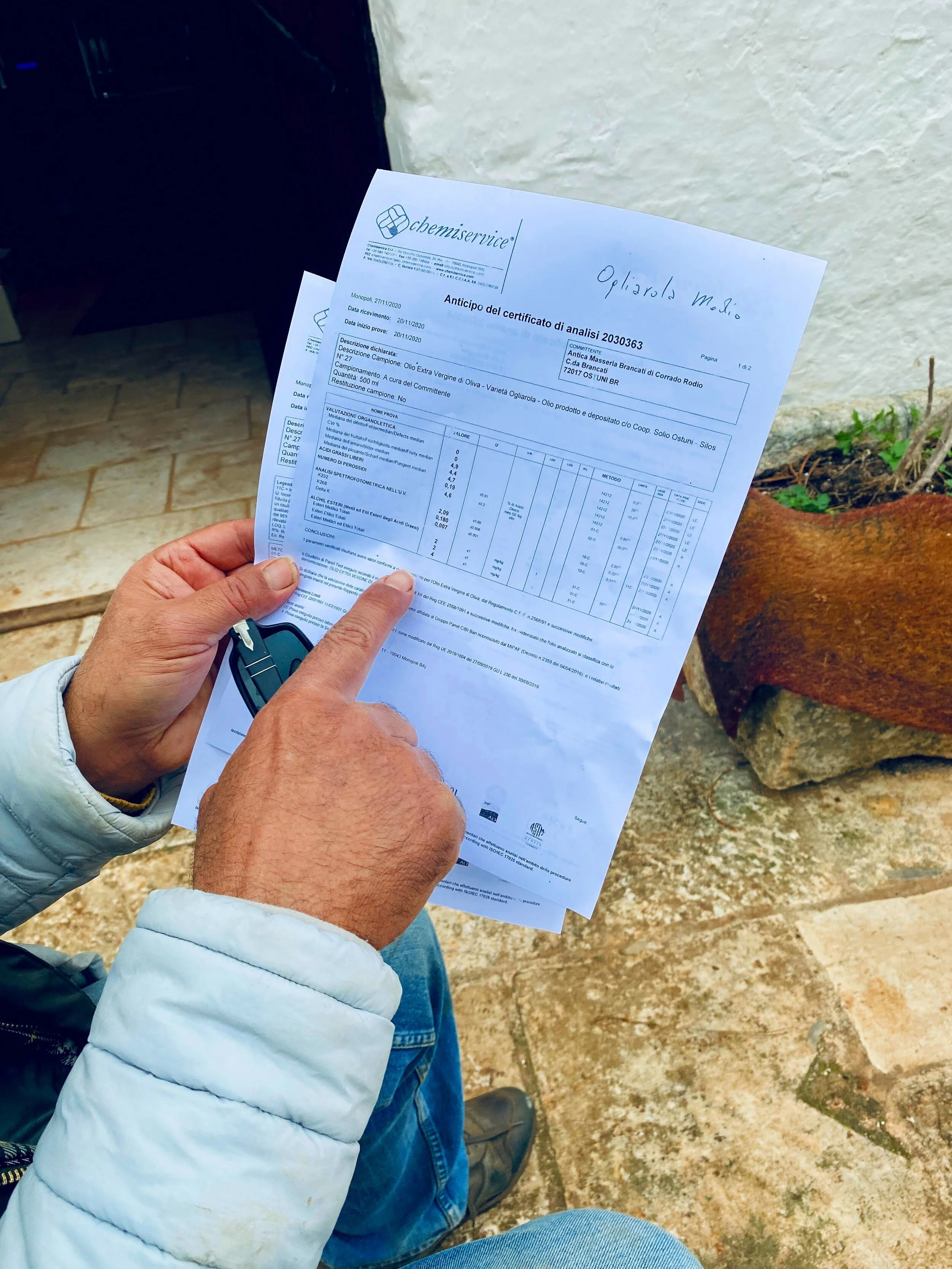 In the center of the picture featured to the left underneath, one may partake of two documents. These are certificates attesting the extra virgin quality of two olive oils produced by one of my key research collaborators, Corrado. The analyses supporting these certificates were carried out by a laboratory in Monopoli and include both chemical and organoleptic analysis of the oils; the significances of the analyses, the data detailed within them, specifications of how they were carried out and the relevance of having them done so to obtain a sort of authentication of these particular oils, were in detail explained to me by Corrado in the yard of his masseria in early December. The conversation was incredibly interesting and particularly valuable for me to understand the contextual scope of much of what I through my fieldwork up to that point and afterwards have experienced; many aspects of my research transpired evermore curious to further as a direct consequence of this fieldworking event; connections from previous fieldworking experiences and notes emerged in new lights. One such triggering aspect correlates for instance the extent of fraud oils present in the marketplace and the wish to enable a sort of authentication of olive oils of a certain quality; another to the fact that extra virgin olive oils must be void of any sensory detectable defects to be classified as EVOO. The latter was for me a previously unknown matter and I took it from Corrado’s emphasis on the significance of me becoming aware of how to distinguish negative attributes from positive ones—he urged me to develop a sense for what constitutes defects within olive oils, how such come about, and how they may be avoided within practices of olive growing and olive oil production—as an attest that this sensuous matter occurs highly important for evaluating not only oils, but also the work with which they become (one way or another). Keeping a clean mill is for example key to produce olive oils voided defects. Now, while I by no means am able to readily detect and distinguish particular defects such as trained practitioners can—them being able to specify and grade both kind and intensity of fustiness, rancidity, metallic attributes and more—I have as part of my research developed a more attentive awareness of some practices taking place (or not taking place) in the mills and become familiar with how such impact the sensory properties of the oils produced in the given environment. Simply put, and by way of relating my conversation with Corrado to specific fieldworking experiences, I realized the extent to which the meticulous cleaning at some pressing facilities, the void thereof in others, directly corresponds to the sensory experience of the oils produced within them. Furthermore, reflecting upon the fact that no one ever explained the constant cleaning to me as it took place, whereas many other things were explicitly detailed, not least in terms of oils being of the extra virgin quality, it occurred to me that the situated knowledge by which cleaning practices are carried out for many practitioners are practically sensed and routinely engaged. That is, they know through their embodied and emplaced ways of practically engaging extra virgin olive oil production that cleanliness is a prerequisite for obtaining such quality of oils. This knowledge goes by largely in doings through, much more so than in sayings, wherefore it is my understanding that these practitioners know not any defects through theory, but through practice; not through assigned evaluations, but through habitual undertakings of routine work; not through categorical distinctions framed in standardized profile sheets, but through instrumental workings with machineries.