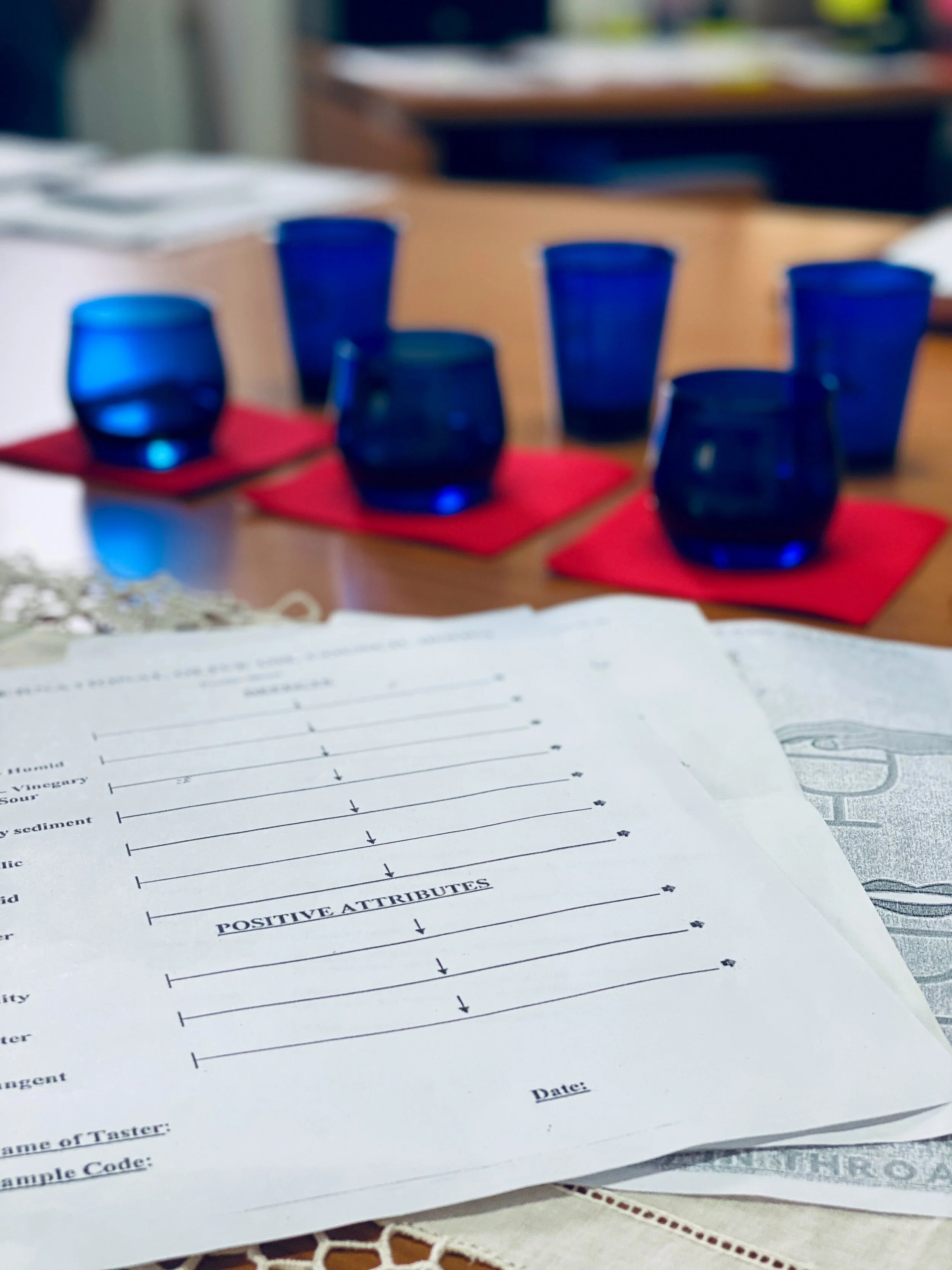 Instrumental as cleaning practices occur performed in certain pressing facilities, instrumental occurs the training and practice to foster expertise for sensory evaluation of oils produced therein (whether performed by certified or otherwise experienced practitioners). As catalogued in the first paragraph of this post, qualifying as an olive oil taster of any degree takes much work and effort, and it requires a highly knowledgeable and perceptually skilled person to become one. I am miles away, with my thus far developed skills of evaluating olive oils—such as related to production techniques, olive cultivars, degrees of maturation and forces of water and oxygen that I through fieldwork encounters have become attuned to—not even close. It is fine though, for as the anthropologist that I am engaging this fieldwork, my purpose of familiarizing myself with the sensuous matters of olive oils rather revolves around my ability to ethnographically understand and critically analyze the situated skills of the practitioners with which my research is carried out, than to myself acquire the skills per se: to contextually explore particular perspectives and how such relates to the settings in which they take place, that is what I am trained to do, that is what I have spent years of schooling becoming skilled at, and that is where my line of expertise is founded. That noted, however, as much of my research occurs through a learn-by-doing mode of engagement, me participating in the work of the people who I conduct my research with, I have surely become more skilled and sensuously attuned also to the particular subject matters of study, such as to the production of olive oils, including recognition of various qualities thereof. It therefore occurs as such, that I, in unfolding and comprehending the practices and settings with which my research is concerned by means of an anthropological undertaking grounded in participant practice (Pink 2015: 6, 97-98), through time, space and practice have become habitually situated in the context of their occurrence, and thus, myself developed a much embodied and emplaced understanding for the things taking place. For, as I attune my body and rhythm, hearing and listening, tasting and savoring, touching and feeling, smelling and scenting, seeing and observing, I have learnt equally well about the subject matters at hand as about the sensor(e)alities through which they come about (cf. Pink 2015; Stoller 1987; van Ede 2009 for references on conducting sensuous scholarship).