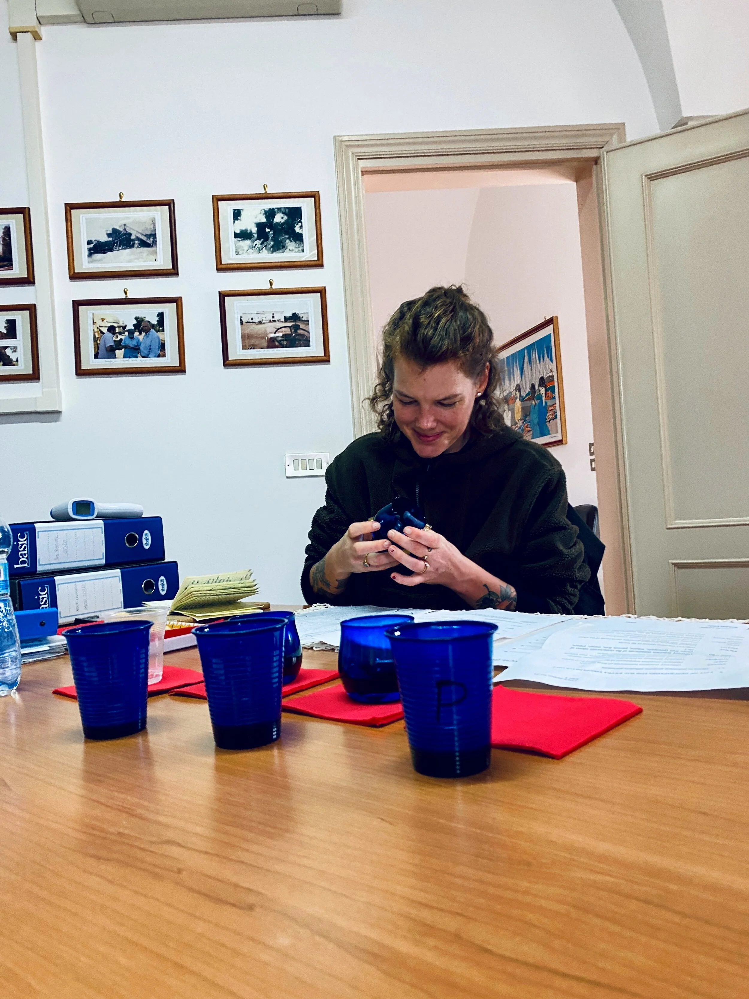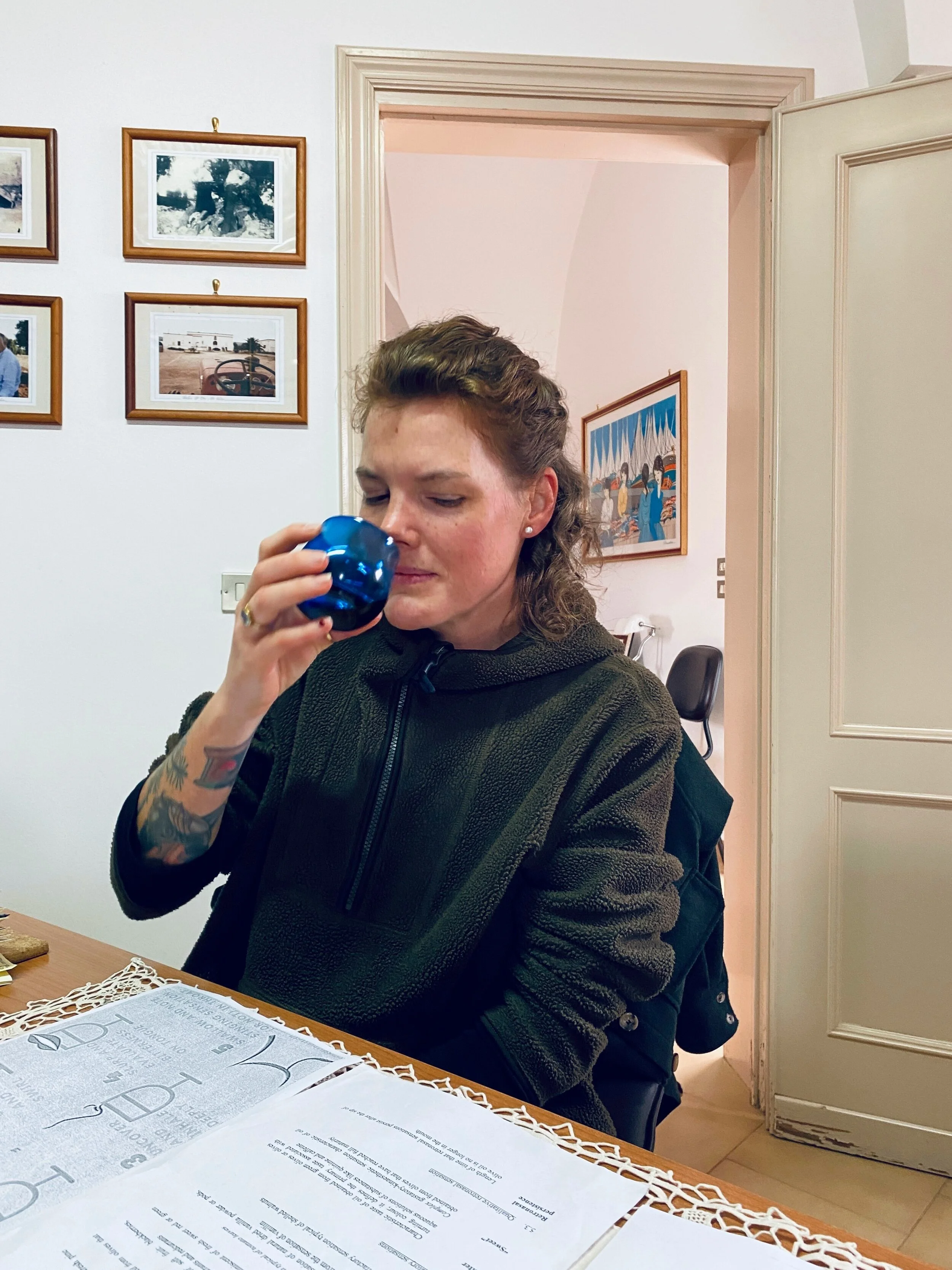 The above visualizes me for the very first time engaging some serious sensory tasting of olive oils. The visuals are from a tasting session taking place earlier this week with a research collaborator who, kindly enough, first level taster as he is, put together an instructive tasting session for me—the purpose of the tasting was for me to ethnographically explore and get a sense of the procedures through which sensory analysis occurs, not to train myself to become a taster—and they feature me undertaking the techniques through which sensory analysis occurs (i.e. with specific colored glasses so to rid biased evaluations related to color, and through a sort of forcefully and pulsatile inhaling of air sense the oil within the mouth and throat). I have many times during my fieldwork tasted oils and attempted to make some kind of sense of their profiles. It happened for instance on a regular basis during the extraction of olive oils in pressing facilities this past harvest season; it occurred, too, common practice as I visited producers in search for possible research collaborators during my prestudies. Those experiences accounted for, this was nonetheless the very first time where I got to put my collective understandings and gathered skills to practice, maybe even advance them a bit, push beyond the scope of personal preferences, and engaging the procedure of sensory analysis as a somewhat knowledgeable person. That is, as one experienced enough to evaluate the fruity, bitter and pungent character of one oil contra another, as one skillful enough to correlate the overall sensory profile of a given oil to the olive cultivar by which it was produced, as one cultivated enough to readily distinguish the one oil of lesser quality from the two of higher qualities, and as one practically engaged enough to critically probe the procedure and how it enacts categorical becomings of different oils and tastes. Happy as I was to feel that I actually had particular knowledge to sensuously put to practice, my expertise in the area only reaches so far. For instance, my ability evaluating oils is not refined enough to pinpoint specific descriptors, if at all, such as an adroit taster may, and this lack of skill on my behalf occurred very much apparent as Giorgio pointed out the grassy note of one of the oils. I had not sensed the grassy note at all, much less realized its dominant presence, not until mentioned by him, whereby I sensed it instantly and strongly. It was kind of an odd experience really, to be so familiar with a smell but unable to scent it, even with my nose stuck deeply into the glass, really trying to recognize particular notes. The experience kind of did not make sense to me at first, and I felt quite perplexed by the absence of sensation followed by the readily recognition thereof. However, as Giorgio reassuringly noted that reference frames are taught and learnt, through guidelines prompted and practical experience enforced, I got to think of the situatedness by which we all come to learn and know, and about the contextual associations that we more or less readily construe thereof: this was not a situation that I related to the scent of freshly cut grass, wherefor I probably did not scent such a smell, albeit the scent as such indeed occur familiar to me. Perhaps my experience had been different, had I, such as Giorgio, been trained to smell for the scent of grassy notes prior to this research encounter.