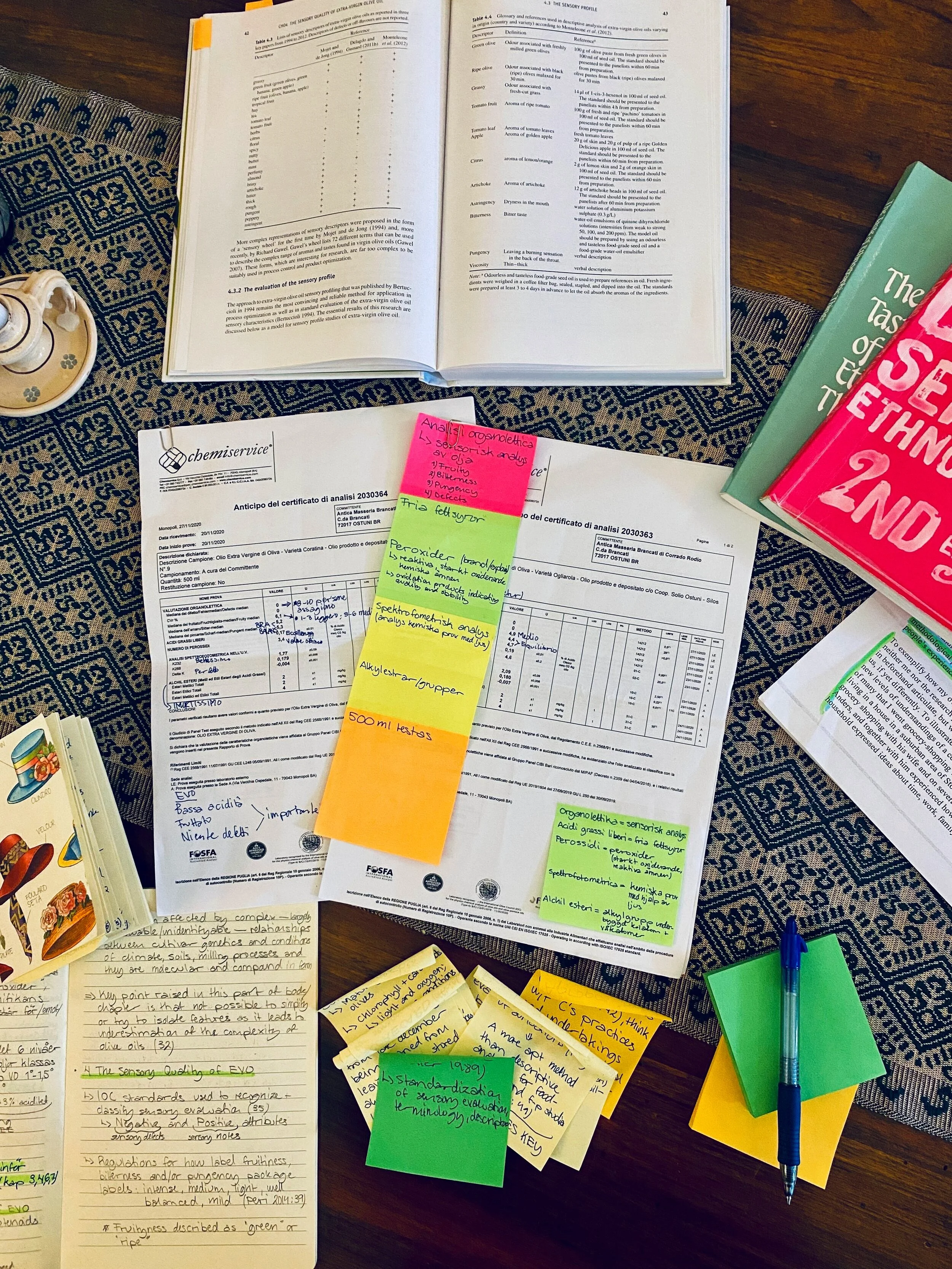 I have by no means become an expert when it comes to conducting sensory analysis of olive oils, far from it, perhaps only developed a brief understanding for the complexity with which such knowledge is concerned, for it is namely, such as so eloquently framed by the work of Monteleone and Langstaff (2014), an entire science in and of itself. Not just that, it is one highly regulated and specified. Likewise, one in requirement of proper and, at times, quite extensive schooling and practice, and this not only with regards to the level of taster that one aspires to become, but also with regards to ongoing participations in descriptive sensory analysis panels whereby one, if selected by a panel head to participate in a particular evaluation, becomes subjected to the calibrated consensus with other tasters that is befitted for evaluations to be properly executed (Peri 2014: 41, 53). Tasting olive oils thus occurs a complex subject indeed. As a matter of fact, to become a certified olive oil taster and master the skills of organoleptic evaluation of so called positive and negative attributes of olive oils (Peri 2014: 35-40), even for the most basic level, one ought to undergo rigid and continuous practice, fulfill specific requirements, pass technical trials, be adept in terms of terminologies and descriptors as well as with scale rating systems and scorecards, develop particular knowledge about procedures of assessing profiles and qualities, and keep up with standards and regulations such as devised by specific manuals, for example by the International Olive Council (2021). One must, too, cultivate standardized reference frames to enable descriptive analysis of principal components and specified attributes. Phew, there is quite a hefty catalogue to master; if only the one requirement to be fulfilled had been that tasters must be “users of extra-virgin olive oil” (Peri 2014: 53), then I would be an eminent candidate for the job with my roughly 2 dl consumption a day. Not joking, seriously. But it is not, and I am despite my vast consumption of extra virgin olive oil, quite limited when it comes to making sensory analysis thereof; according to regulatory qualifications and otherwise.